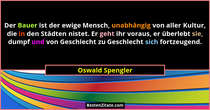 Der Bauer ist der ewige Mensch, unabhängig von aller Kultur, die in den Städten nistet. Er geht ihr voraus, er überlebt sie, dumpf und von Geschlecht zu Geschlecht sich fortzeugend.