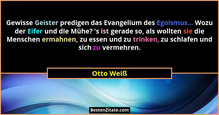 Gewisse Geister predigen das Evangelium des Egoismus... Wozu der Eifer und die Mühe? 's ist gerade so, als wollten sie die Menschen ermahnen, zu essen und zu trinken, zu schlafen und sich zu vermehren.