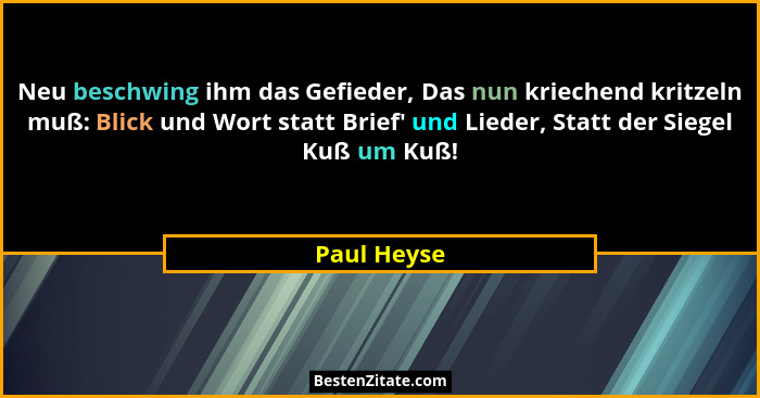 Neu beschwing ihm das Gefieder, Das nun kriechend kritzeln muß: Blick und Wort statt Brief' und Lieder, Statt der Siegel Kuß um Kuß!