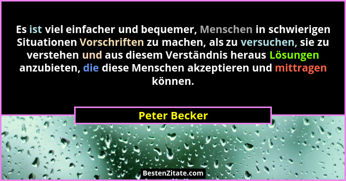 Es ist viel einfacher und bequemer, Menschen in schwierigen Situationen Vorschriften zu machen, als zu versuchen, sie zu verstehen und aus diesem Verständnis heraus Lösungen anzubieten, die diese Menschen akzeptieren und mittragen können.