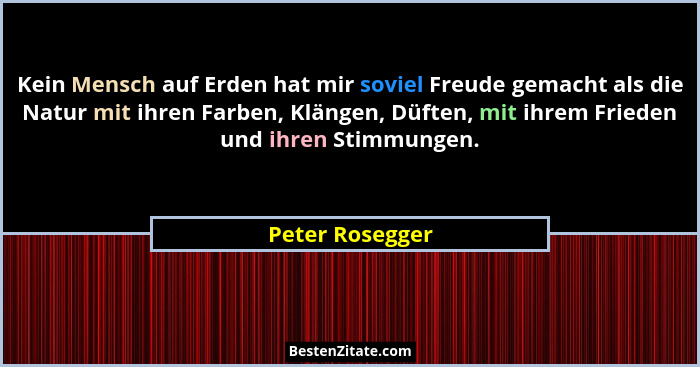Kein Mensch auf Erden hat mir soviel Freude gemacht als die Natur mit ihren Farben, Klängen, Düften, mit ihrem Frieden und ihren Stimmungen.