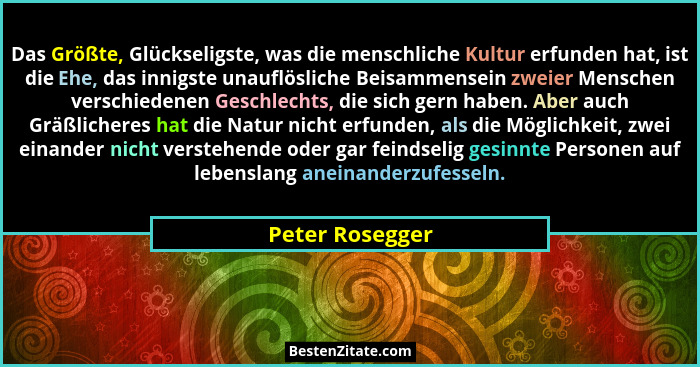 Das Größte, Glückseligste, was die menschliche Kultur erfunden hat, ist die Ehe, das innigste unauflösliche Beisammensein zweier Menschen verschiedenen Geschlechts, die sich gern haben. Aber auch Gräßlicheres hat die Natur nicht erfunden, als die Möglichkeit, zwei einander nicht verstehende oder gar feindselig gesinnte Personen auf lebenslang aneinanderzufesseln.
