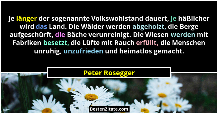 Je länger der sogenannte Volkswohlstand dauert, je häßlicher wird das Land. Die Wälder werden abgeholzt, die Berge aufgeschürft, die Bäche verunreinigt. Die Wiesen werden mit Fabriken besetzt, die Lüfte mit Rauch erfüllt, die Menschen unruhig, unzufrieden und heimatlos gemacht.