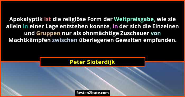Apokalyptik ist die religiöse Form der Weltpreisgabe, wie sie allein in einer Lage entstehen konnte, in der sich die Einzelnen und Gruppen nur als ohnmächtige Zuschauer von Machtkämpfen zwischen überlegenen Gewalten empfanden.