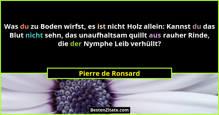 Was du zu Boden wirfst, es ist nicht Holz allein: Kannst du das Blut nicht sehn, das unaufhaltsam quillt aus rauher Rinde, die der Nymphe Leib verhüllt?