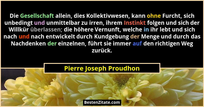 Die Gesellschaft allein, dies Kollektivwesen, kann ohne Furcht, sich unbedingt und unmittelbar zu irren, ihrem Instinkt folgen und sich der Willkür überlassen; die höhere Vernunft, welche in ihr lebt und sich nach und nach entwickelt durch Kundgebung der Menge und durch das Nachdenken der einzelnen, führt sie immer auf den richtigen Weg zurück.
