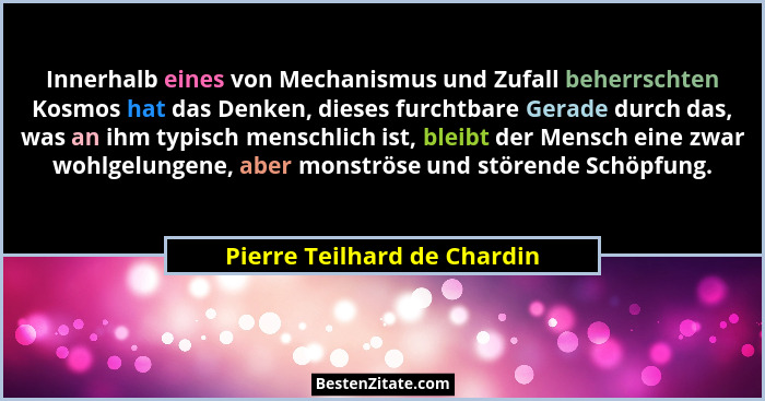 Innerhalb eines von Mechanismus und Zufall beherrschten Kosmos hat das Denken, dieses furchtbare Gerade durch das, was an ihm typisch menschlich ist, bleibt der Mensch eine zwar wohlgelungene, aber monströse und störende Schöpfung.