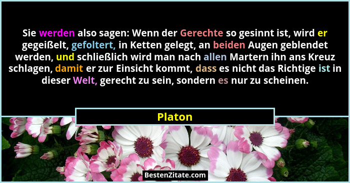 Sie werden also sagen: Wenn der Gerechte so gesinnt ist, wird er gegeißelt, gefoltert, in Ketten gelegt, an beiden Augen geblendet werden, und schließlich wird man nach allen Martern ihn ans Kreuz schlagen, damit er zur Einsicht kommt, dass es nicht das Richtige ist in dieser Welt, gerecht zu sein, sondern es nur zu scheinen.