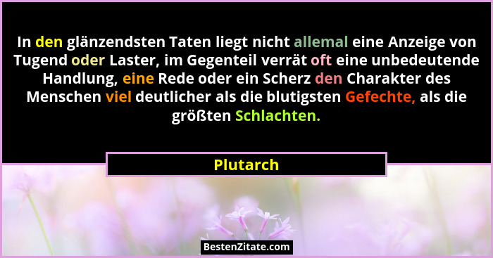 In den glänzendsten Taten liegt nicht allemal eine Anzeige von Tugend oder Laster, im Gegenteil verrät oft eine unbedeutende Handlung, eine Rede oder ein Scherz den Charakter des Menschen viel deutlicher als die blutigsten Gefechte, als die größten Schlachten.