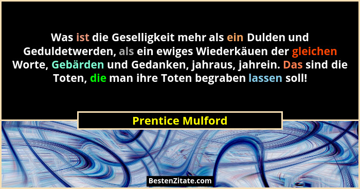 Was ist die Geselligkeit mehr als ein Dulden und Geduldetwerden, als ein ewiges Wiederkäuen der gleichen Worte, Gebärden und Gedanken, jahraus, jahrein. Das sind die Toten, die man ihre Toten begraben lassen soll!