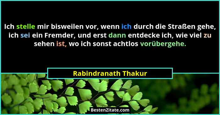 Ich stelle mir bisweilen vor, wenn ich durch die Straßen gehe, ich sei ein Fremder, und erst dann entdecke ich, wie viel zu sehen ist, wo ich sonst achtlos vorübergehe.