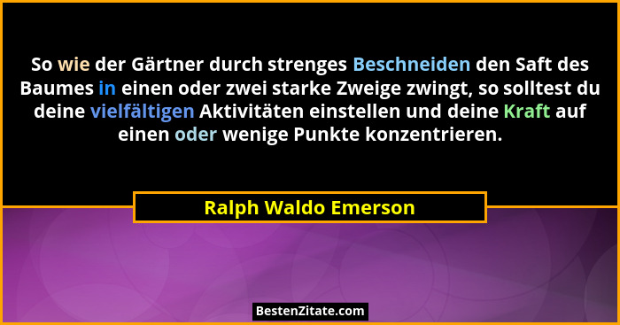 So wie der Gärtner durch strenges Beschneiden den Saft des Baumes in einen oder zwei starke Zweige zwingt, so solltest du deine vielfältigen Aktivitäten einstellen und deine Kraft auf einen oder wenige Punkte konzentrieren.
