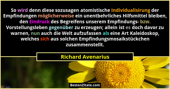So wird denn diese sozusagen atomistische Individualisirung der Empfindungen möglicherweise ein unentbehrliches Hilfsmittel bleiben, den Eindruck des Begreifens unserem Empfindungs- bzw. Vorstellungsleben gegenüber zu erzeugen; allein ist es doch davor zu warnen, nun auch die Welt aufzufassen als eine Art Kaleidoskop, welches sich aus solchen Empfindungsmosaikstückchen zusammenstellt.