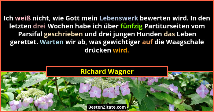 Ich weiß nicht, wie Gott mein Lebenswerk bewerten wird. In den letzten drei Wochen habe ich über fünfzig Partiturseiten vom Parsifal geschrieben und drei jungen Hunden das Leben gerettet. Warten wir ab, was gewichtiger auf die Waagschale drücken wird.