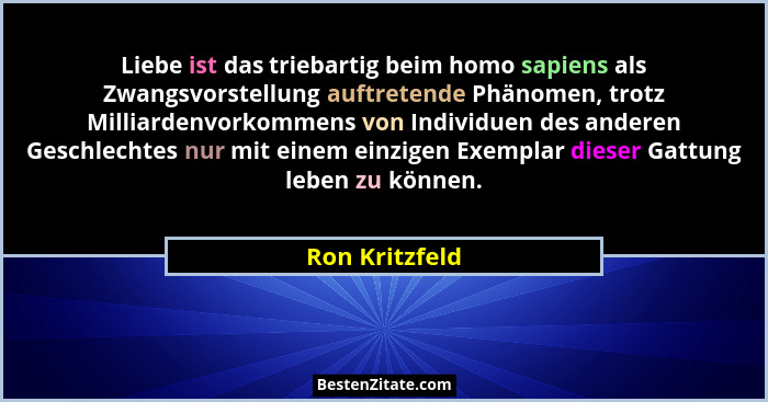 Liebe ist das triebartig beim homo sapiens als Zwangsvorstellung auftretende Phänomen, trotz Milliardenvorkommens von Individuen des anderen Geschlechtes nur mit einem einzigen Exemplar dieser Gattung leben zu können.