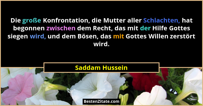 Die große Konfrontation, die Mutter aller Schlachten, hat begonnen zwischen dem Recht, das mit der Hilfe Gottes siegen wird, und dem Bösen, das mit Gottes Willen zerstört wird.
