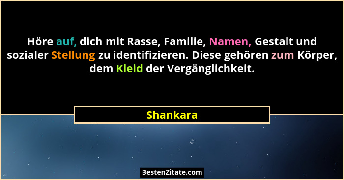 Höre auf, dich mit Rasse, Familie, Namen, Gestalt und sozialer Stellung zu identifizieren. Diese gehören zum Körper, dem Kleid der Vergänglichkeit.