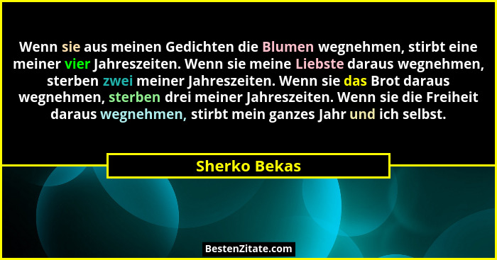 Wenn sie aus meinen Gedichten die Blumen wegnehmen, stirbt eine meiner vier Jahreszeiten. Wenn sie meine Liebste daraus wegnehmen, sterben zwei meiner Jahreszeiten. Wenn sie das Brot daraus wegnehmen, sterben drei meiner Jahreszeiten. Wenn sie die Freiheit daraus wegnehmen, stirbt mein ganzes Jahr und ich selbst.
