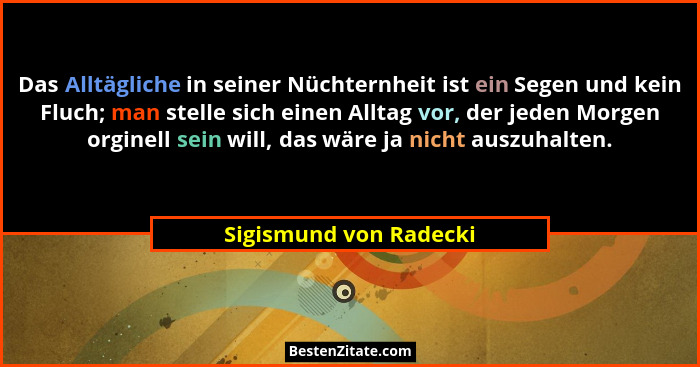 Das Alltägliche in seiner Nüchternheit ist ein Segen und kein Fluch; man stelle sich einen Alltag vor, der jeden Morgen orginell sein will, das wäre ja nicht auszuhalten.