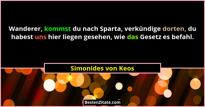 Wanderer, kommst du nach Sparta, verkündige dorten, du habest uns hier liegen gesehen, wie das Gesetz es befahl.