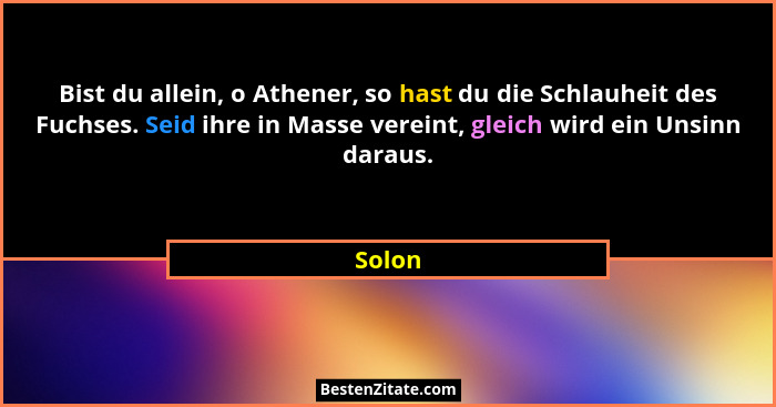 Bist du allein, o Athener, so hast du die Schlauheit des Fuchses. Seid ihre in Masse vereint, gleich wird ein Unsinn daraus.