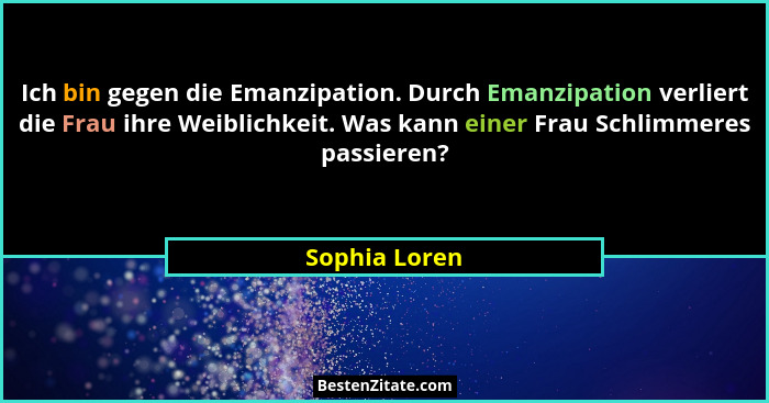Ich bin gegen die Emanzipation. Durch Emanzipation verliert die Frau ihre Weiblichkeit. Was kann einer Frau Schlimmeres passieren?