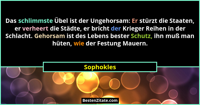 Das schlimmste Übel ist der Ungehorsam: Er stürzt die Staaten, er verheert die Städte, er bricht der Krieger Reihen in der Schlacht. Gehorsam ist des Lebens bester Schutz, ihn muß man hüten, wie der Festung Mauern.