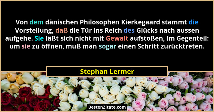 Von dem dänischen Philosophen Kierkegaard stammt die Vorstellung, daß die Tür ins Reich des Glücks nach aussen aufgehe. Sie läßt sich nicht mit Gewalt aufstoßen, im Gegenteil: um sie zu öffnen, muß man sogar einen Schritt zurücktreten.
