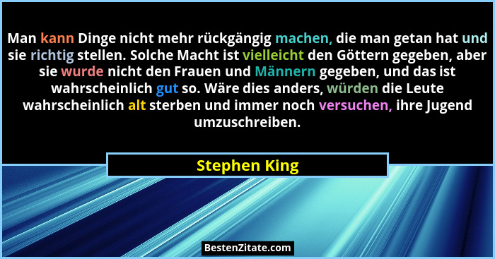 Man kann Dinge nicht mehr rückgängig machen, die man getan hat und sie richtig stellen. Solche Macht ist vielleicht den Göttern gegeben, aber sie wurde nicht den Frauen und Männern gegeben, und das ist wahrscheinlich gut so. Wäre dies anders, würden die Leute wahrscheinlich alt sterben und immer noch versuchen, ihre Jugend umzuschreiben.