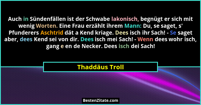 Auch in Sündenfällen ist der Schwabe lakonisch, begnügt er sich mit wenig Worten. Eine Frau erzählt ihrem Mann: Du, se saget, s' Pfunderers Aschtrid dät a Kend kriage. Dees isch ihr Sach! - Se saget aber, dees Kend sei von dir. Dees isch mei Sach! - Wenn dees wohr isch, gang e en de Necker. Dees isch dei Sach!