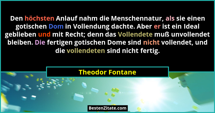 Den höchsten Anlauf nahm die Menschennatur, als sie einen gotischen Dom in Vollendung dachte. Aber er ist ein Ideal geblieben und mit Recht; denn das Vollendete muß unvollendet bleiben. Die fertigen gotischen Dome sind nicht vollendet, und die vollendeten sind nicht fertig.