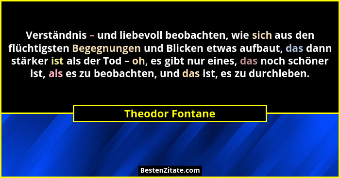 Verständnis – und liebevoll beobachten, wie sich aus den flüchtigsten Begegnungen und Blicken etwas aufbaut, das dann stärker ist als der Tod – oh, es gibt nur eines, das noch schöner ist, als es zu beobachten, und das ist, es zu durchleben.