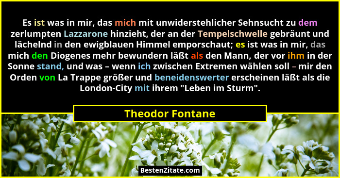 Es ist was in mir, das mich mit unwiderstehlicher Sehnsucht zu dem zerlumpten Lazzarone hinzieht, der an der Tempelschwelle gebräunt und lächelnd in den ewigblauen Himmel emporschaut; es ist was in mir, das mich den Diogenes mehr bewundern läßt als den Mann, der vor ihm in der Sonne stand, und was – wenn ich zwischen Extremen wählen soll – mir den Orden von La Trappe größer und beneidenswerter erscheinen läßt als die London-City mit ihrem "Leben im Sturm".