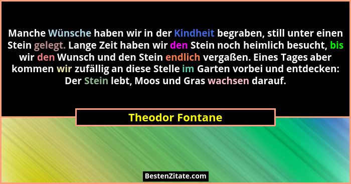 Manche Wünsche haben wir in der Kindheit begraben, still unter einen Stein gelegt. Lange Zeit haben wir den Stein noch heimlich besucht, bis wir den Wunsch und den Stein endlich vergaßen. Eines Tages aber kommen wir zufällig an diese Stelle im Garten vorbei und entdecken: Der Stein lebt, Moos und Gras wachsen darauf.