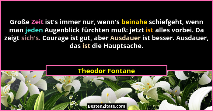 Große Zeit ist's immer nur, wenn's beinahe schiefgeht, wenn man jeden Augenblick fürchten muß: jetzt ist alles vorbei. Da zeigt sich's. Courage ist gut, aber Ausdauer ist besser. Ausdauer, das ist die Hauptsache.