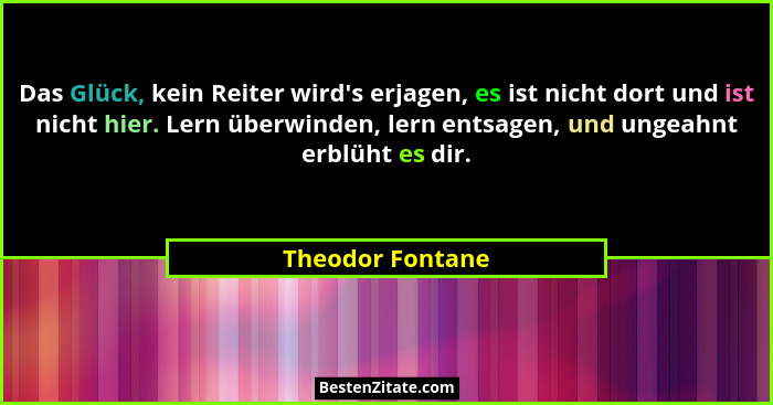 Das Glück, kein Reiter wird's erjagen, es ist nicht dort und ist nicht hier. Lern überwinden, lern entsagen, und ungeahnt erblüht es dir.