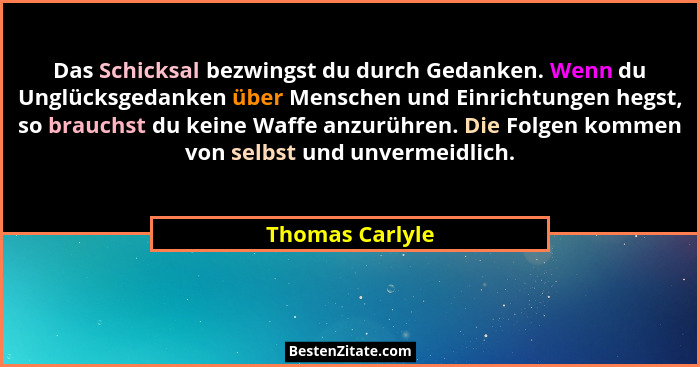 Das Schicksal bezwingst du durch Gedanken. Wenn du Unglücksgedanken über Menschen und Einrichtungen hegst, so brauchst du keine Waffe anzurühren. Die Folgen kommen von selbst und unvermeidlich.