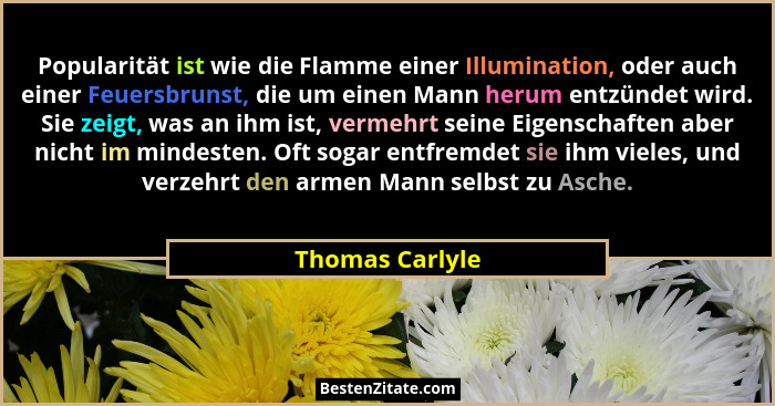 Popularität ist wie die Flamme einer Illumination, oder auch einer Feuersbrunst, die um einen Mann herum entzündet wird. Sie zeigt, was an ihm ist, vermehrt seine Eigenschaften aber nicht im mindesten. Oft sogar entfremdet sie ihm vieles, und verzehrt den armen Mann selbst zu Asche.