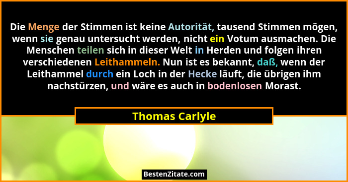Die Menge der Stimmen ist keine Autorität, tausend Stimmen mögen, wenn sie genau untersucht werden, nicht ein Votum ausmachen. Die Menschen teilen sich in dieser Welt in Herden und folgen ihren verschiedenen Leithammeln. Nun ist es bekannt, daß, wenn der Leithammel durch ein Loch in der Hecke läuft, die übrigen ihm nachstürzen, und wäre es auch in bodenlosen Morast.