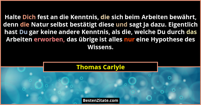 Halte Dich fest an die Kenntnis, die sich beim Arbeiten bewährt, denn die Natur selbst bestätigt diese und sagt Ja dazu. Eigentlich hast Du gar keine andere Kenntnis, als die, welche Du durch das Arbeiten erworben, das übrige ist alles nur eine Hypothese des Wissens.
