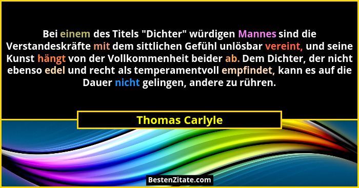 Bei einem des Titels "Dichter" würdigen Mannes sind die Verstandeskräfte mit dem sittlichen Gefühl unlösbar vereint, und seine Kunst hängt von der Vollkommenheit beider ab. Dem Dichter, der nicht ebenso edel und recht als temperamentvoll empfindet, kann es auf die Dauer nicht gelingen, andere zu rühren.