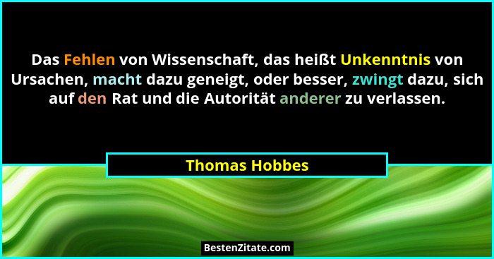 Das Fehlen von Wissenschaft, das heißt Unkenntnis von Ursachen, macht dazu geneigt, oder besser, zwingt dazu, sich auf den Rat und die Autorität anderer zu verlassen.