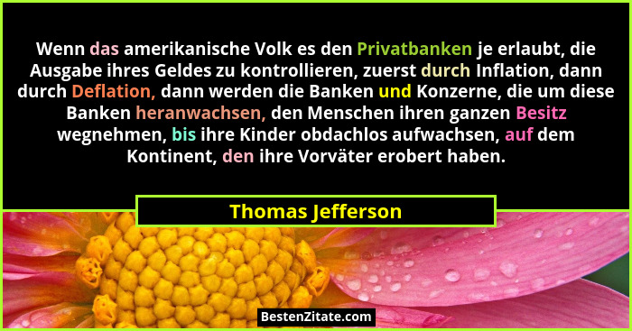 Wenn das amerikanische Volk es den Privatbanken je erlaubt, die Ausgabe ihres Geldes zu kontrollieren, zuerst durch Inflation, dann durch Deflation, dann werden die Banken und Konzerne, die um diese Banken heranwachsen, den Menschen ihren ganzen Besitz wegnehmen, bis ihre Kinder obdachlos aufwachsen, auf dem Kontinent, den ihre Vorväter erobert haben.