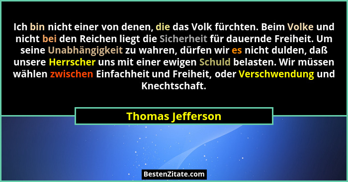 Ich bin nicht einer von denen, die das Volk fürchten. Beim Volke und nicht bei den Reichen liegt die Sicherheit für dauernde Freiheit. Um seine Unabhängigkeit zu wahren, dürfen wir es nicht dulden, daß unsere Herrscher uns mit einer ewigen Schuld belasten. Wir müssen wählen zwischen Einfachheit und Freiheit, oder Verschwendung und Knechtschaft.