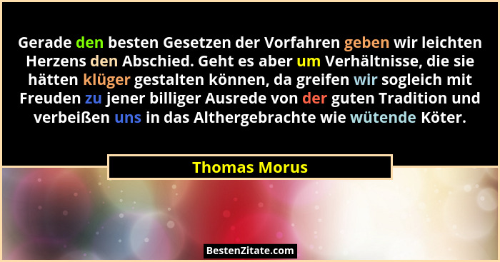 Gerade den besten Gesetzen der Vorfahren geben wir leichten Herzens den Abschied. Geht es aber um Verhältnisse, die sie hätten klüger gestalten können, da greifen wir sogleich mit Freuden zu jener billiger Ausrede von der guten Tradition und verbeißen uns in das Althergebrachte wie wütende Köter.