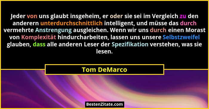 Jeder von uns glaubt insgeheim, er oder sie sei im Vergleich zu den anderern unterdurchschnittlich intelligent, und müsse das durch vermehrte Anstrengung ausgleichen. Wenn wir uns durch einen Morast von Komplexität hindurcharbeiten, lassen uns unsere Selbstzweifel glauben, dass alle anderen Leser der Spezifikation verstehen, was sie lesen.