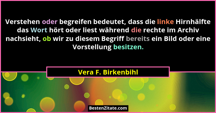Verstehen oder begreifen bedeutet, dass die linke Hirnhälfte das Wort hört oder liest während die rechte im Archiv nachsieht, ob wir zu diesem Begriff bereits ein Bild oder eine Vorstellung besitzen.