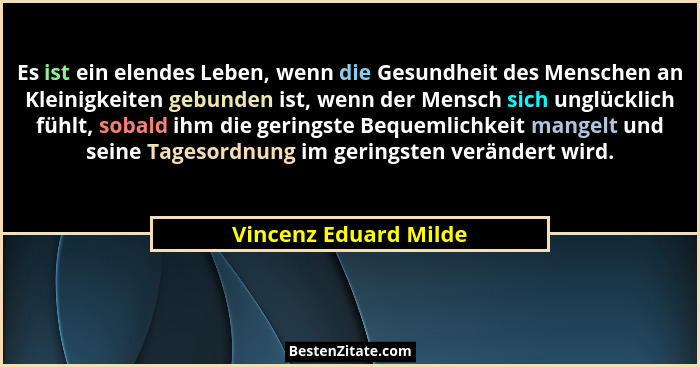 Es ist ein elendes Leben, wenn die Gesundheit des Menschen an Kleinigkeiten gebunden ist, wenn der Mensch sich unglücklich fühlt, sobald ihm die geringste Bequemlichkeit mangelt und seine Tagesordnung im geringsten verändert wird.