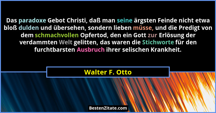 Das paradoxe Gebot Christi, daß man seine ärgsten Feinde nicht etwa bloß dulden und übersehen, sondern lieben müsse, und die Predigt von dem schmachvollen Opfertod, den ein Gott zur Erlösung der verdammten Welt gelitten, das waren die Stichworte für den furchtbarsten Ausbruch ihrer selischen Krankheit.