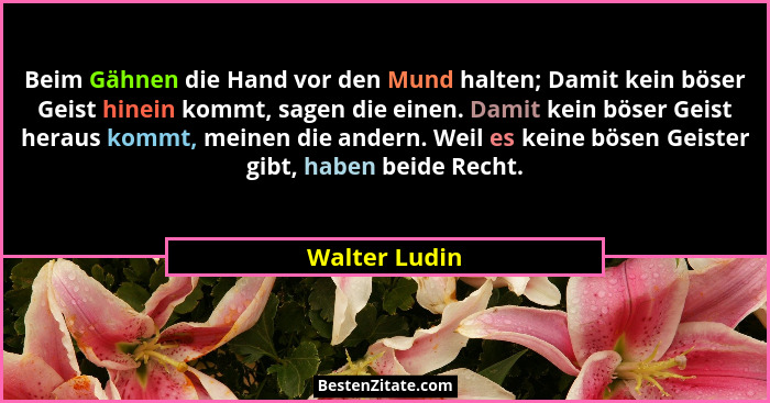 Beim Gähnen die Hand vor den Mund halten; Damit kein böser Geist hinein kommt, sagen die einen. Damit kein böser Geist heraus kommt, meinen die andern. Weil es keine bösen Geister gibt, haben beide Recht.